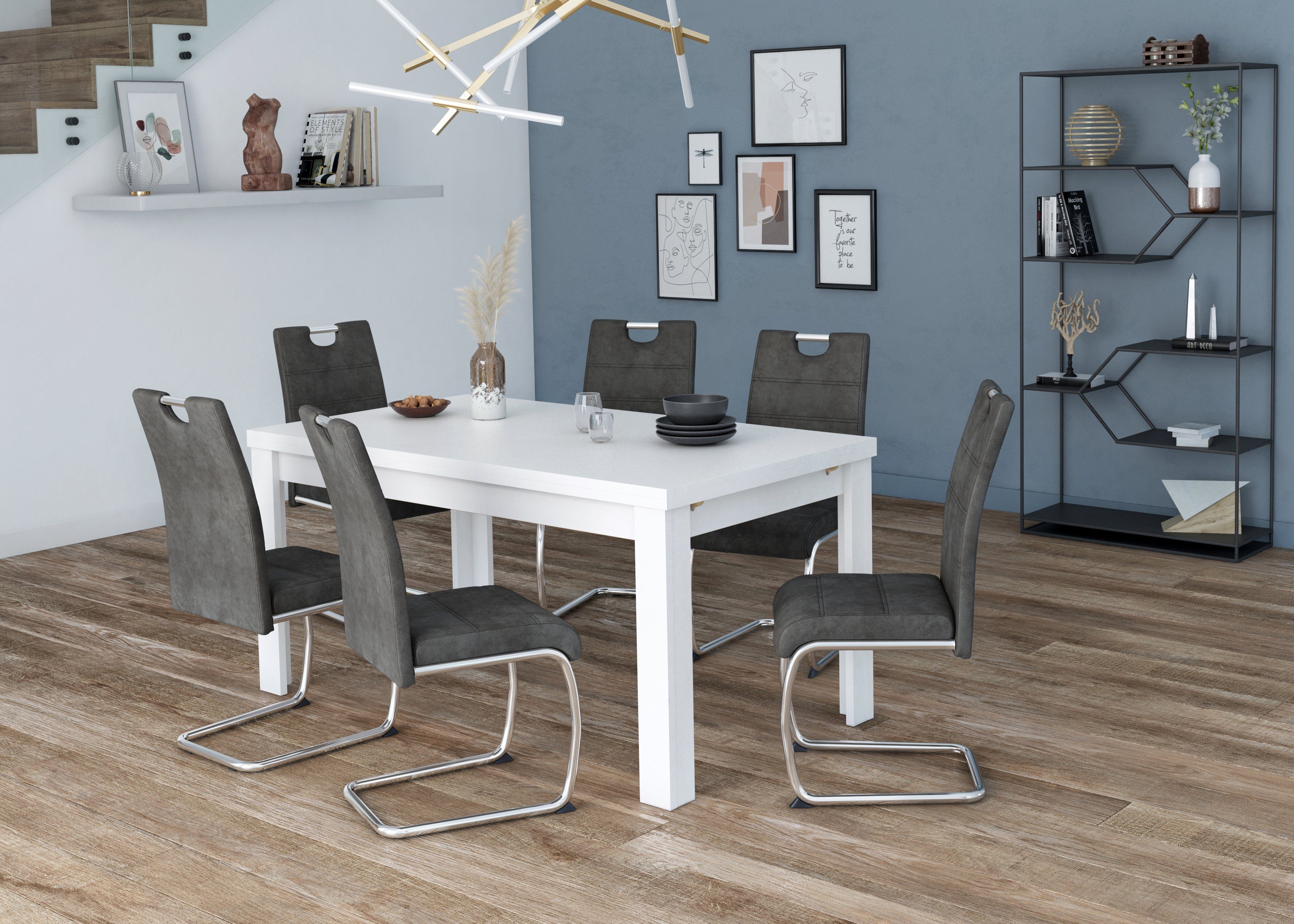 Durch zwei integrierte platten ist der tisch für zwölf personen ausziehbar.